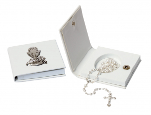Astuccio in ecopelle bianco con bottoncino e placca in bilaminato d'argento raffigurante simboli religiosi ed immagini sacre.