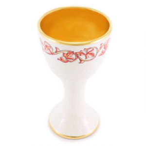 Calice in ceramica decrato,eseguito con la massima cura per i particolari. La coppa interna viene realizzata con foglia oro come previsto dalla liturgia. Lavorazione raffinata che viene realizzata in modo completamente artigianale e dipinta a mano con decori preziosi e pregiati dove la manualità si esprime nella cura del dettaglio e nella scelta dei colori e delle forme. Made in Italy