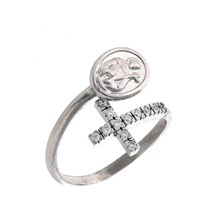 -> ANELLO ARGENTO TIT.925°/°° CON ZIRCONI CROCE E MED. SAN FRANCESCO REGOLABILE